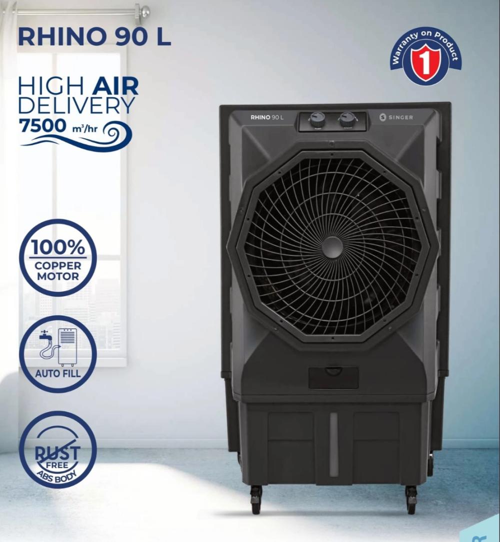 Singer Rhino 90L ek heavy-duty commercial air cooler hai jo specially large areas jaise showroom, shop, hall aur warehouse ke liye design kiya gaya hai. Isme 90 litre ka water tank diya gaya hai jo long hours tak continuous cooling provide karta hai.